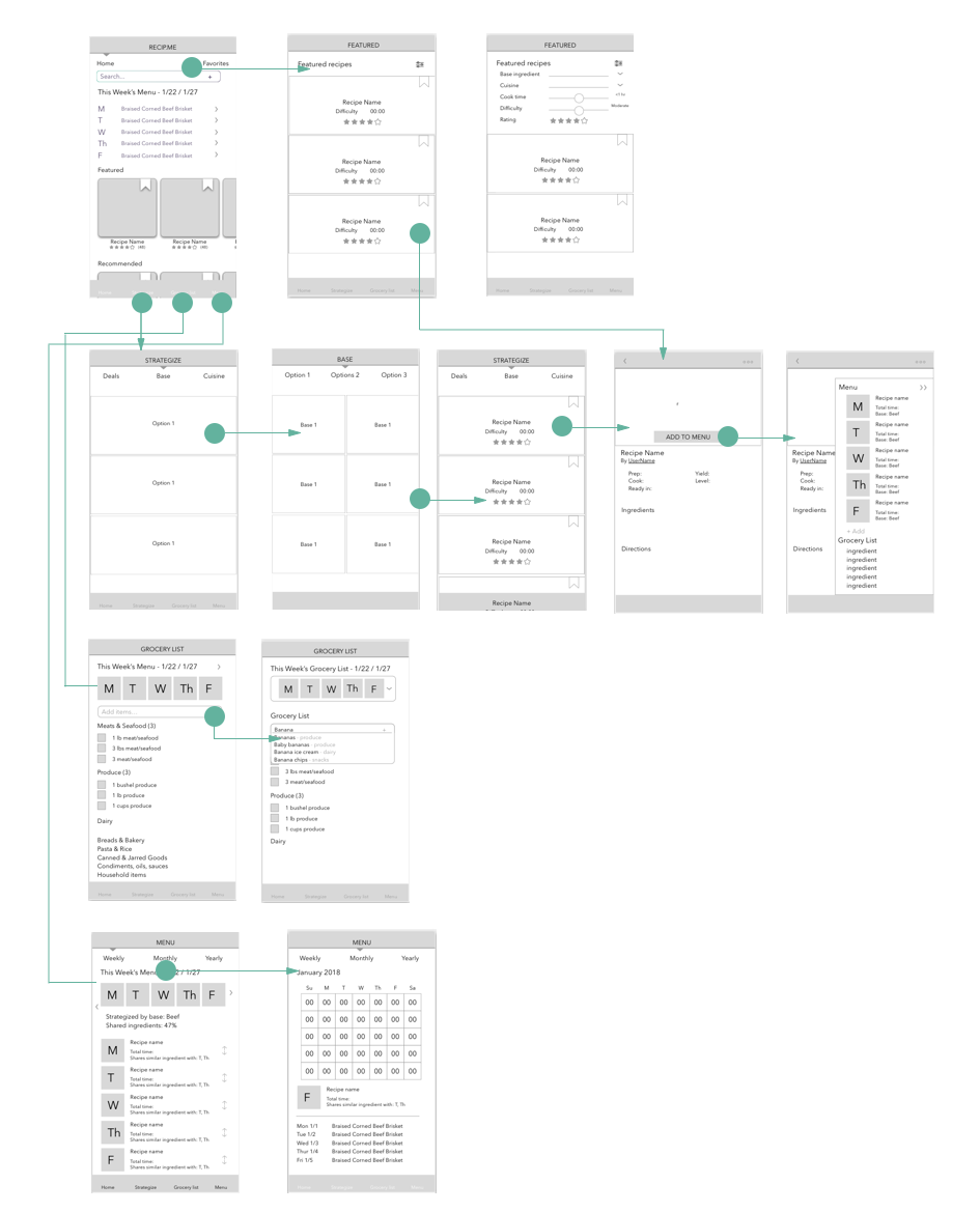 Users will be able to effectively plan their meals based on recipes that share common ingredients to optimize their grocery list and spending. The app guides users through the meal planning processes, and provides a variety of different starting points for their meal planning process. They can search by base ingredient (protein, card, veggie), by what's on sale around them, or by cuisine. The app will then aggregate recipes that fit the criteria, and will use an algorithm to suggest recipes that have similar ingredients to reduce the variety of ingredients needed to be purchased during a grocery trip. The app will also track ingredients from past lists.